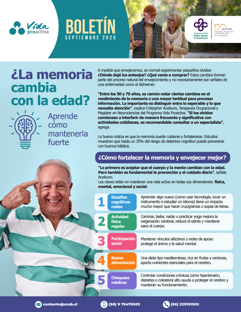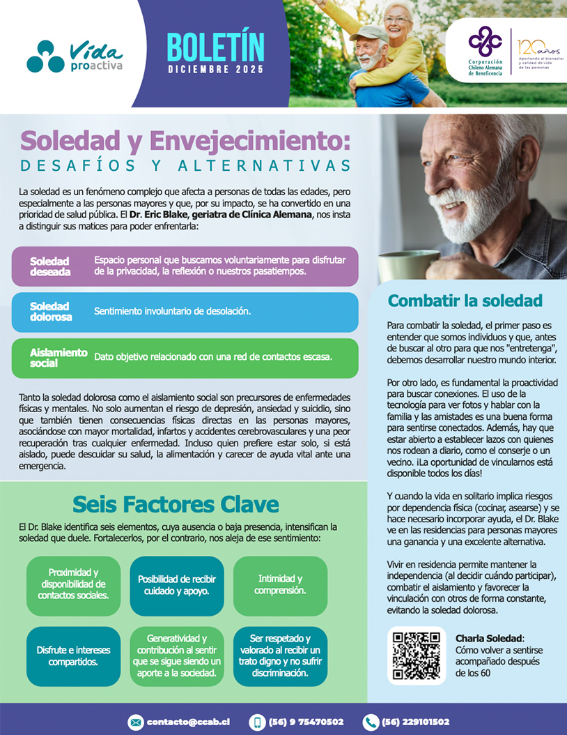 El programa Vida Proactiva surgió como una propuesta para contribuir a mejorar la calidad de vida y salud de los socios personas mayores de la Corporación Chileno Alemana de Beneficencia. Hoy es un espacio consolidado de aprendizaje, encuentro y recreación para sus participantes.